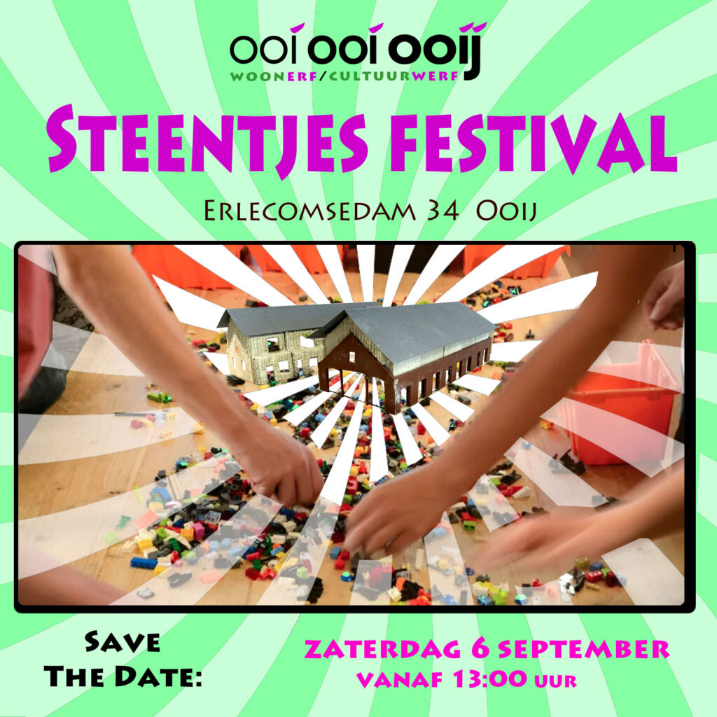 Er zijn zoveel manieren om steentjes bij te dragen aan Ooi Ooi Ooij! Dus pak je kiezels, je keien en je klinkers in en kom met ons feest vieren op 6 September vanaf 13:00. Het steentjesfestival is het spetterende startschot van onze crowdlending actie. Help je ons door obligaties te (ver)kopen? Een gift te doen? Of door feest met ons te vieren? Laat dan weten dat je komt!